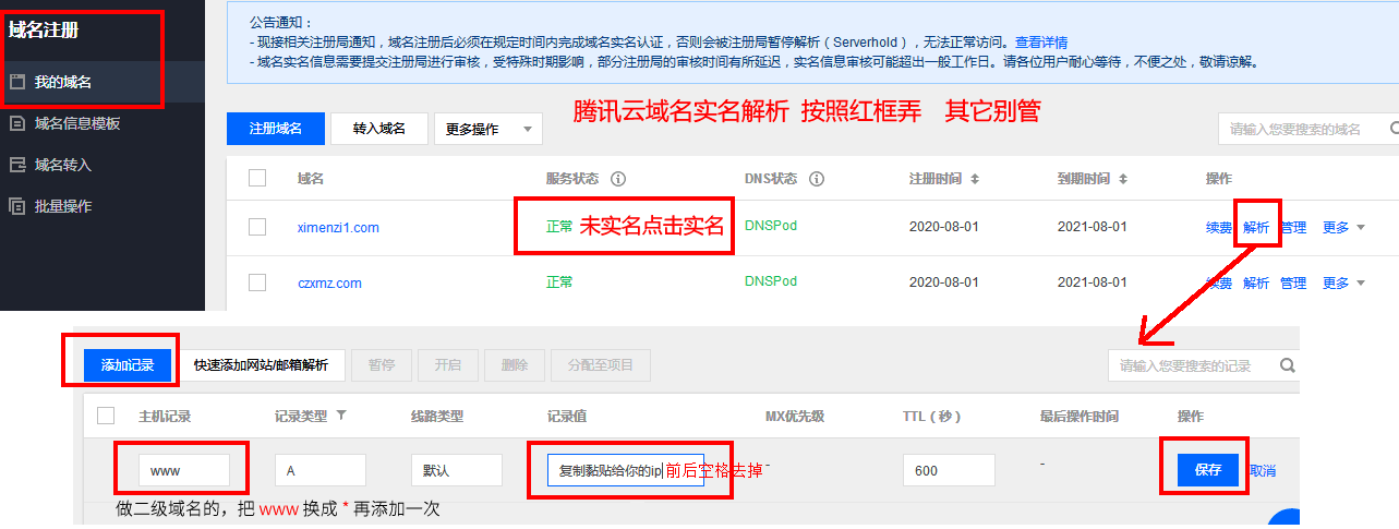阿里云域名解析示意圖 騰訊云域名解析實名認證示意圖 實名認證通過解析才能生效。